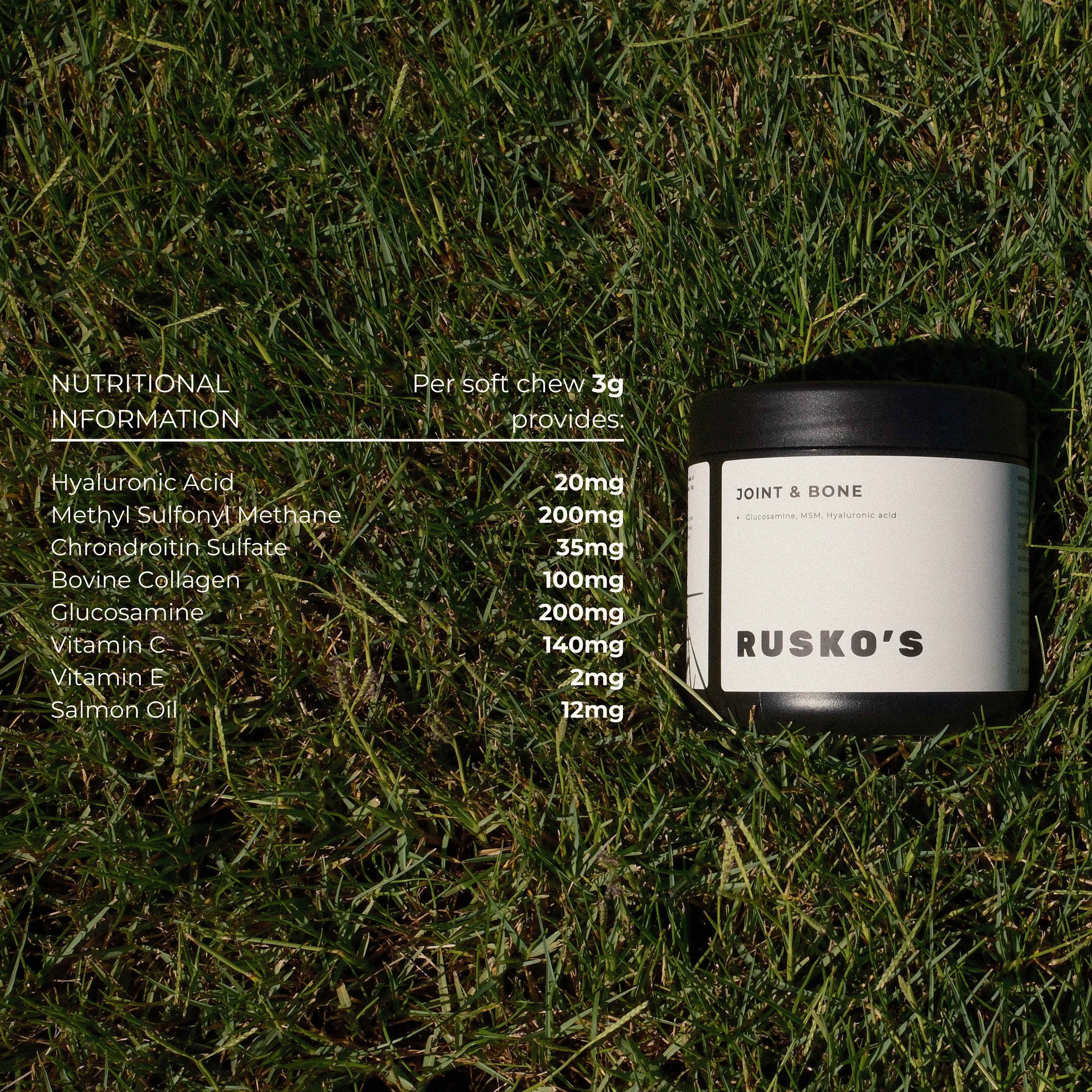 Inactivated Brewer’s Yeast, Potato Starch, Vegetable Glycerin, Potato Flakes, Dried Apple Pulp, Glucosamine From Animal Tissue (Crustaceans), Dimethyl Sulfone (MSM), Refined Coconut Oil, Vitamin C, Dried Tapioca, Lecithin, Beef Collagen, Flavouring, Carob Pod Flour, Pork Chondroitin Sulfate, Hyaluronic Acid, Sorbic Acid, Salmon Oil, Linseed Expeller, Antioxidant, Vitamin E.